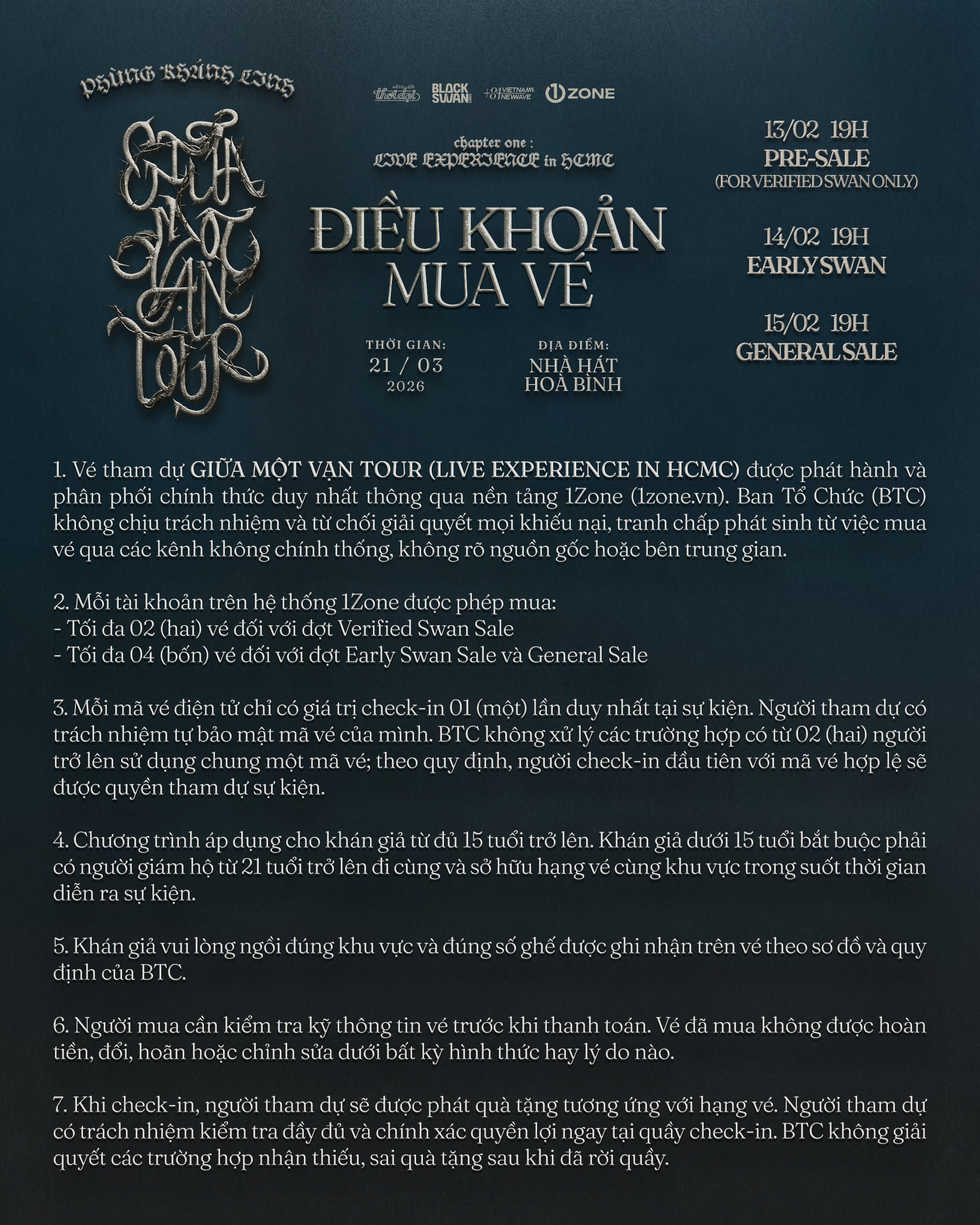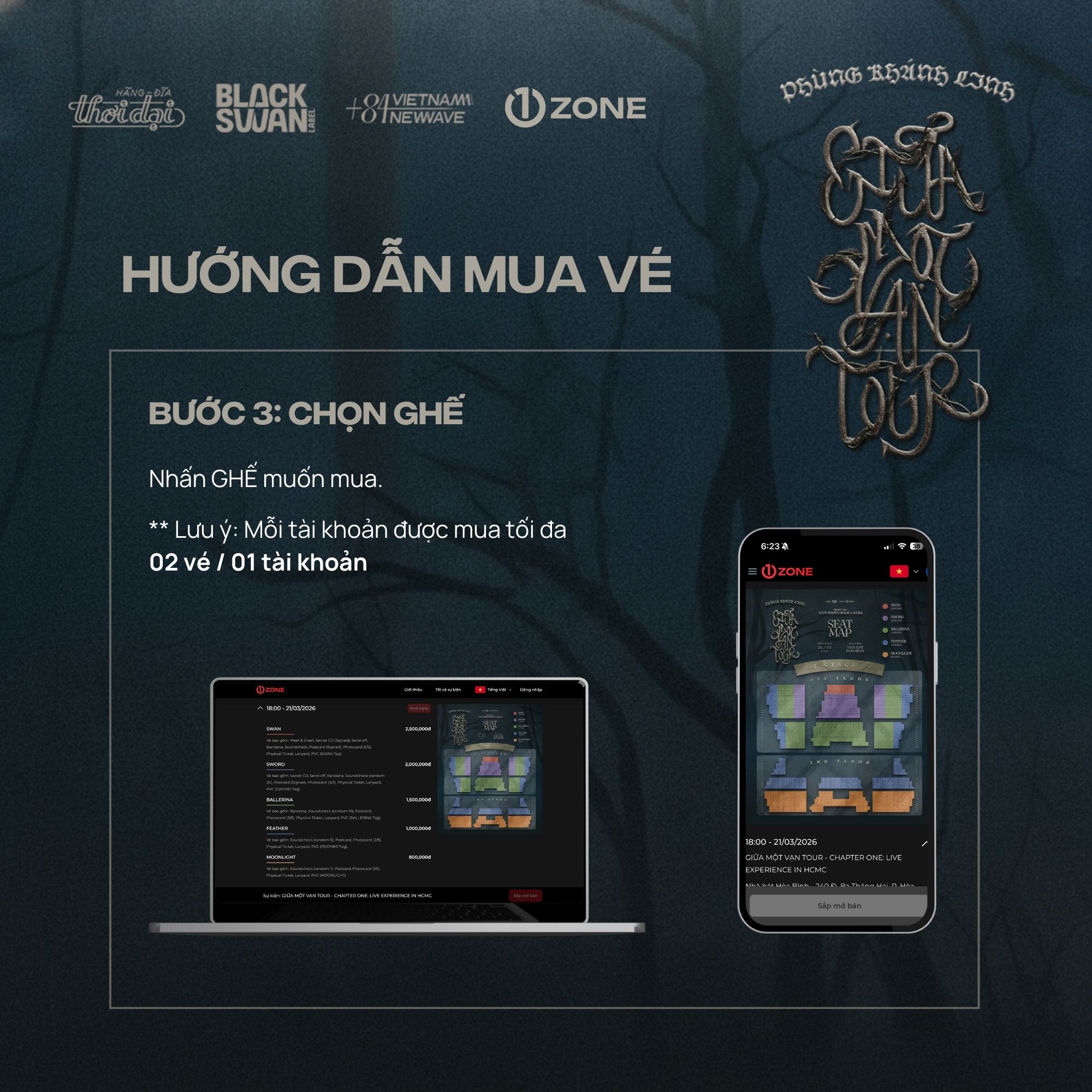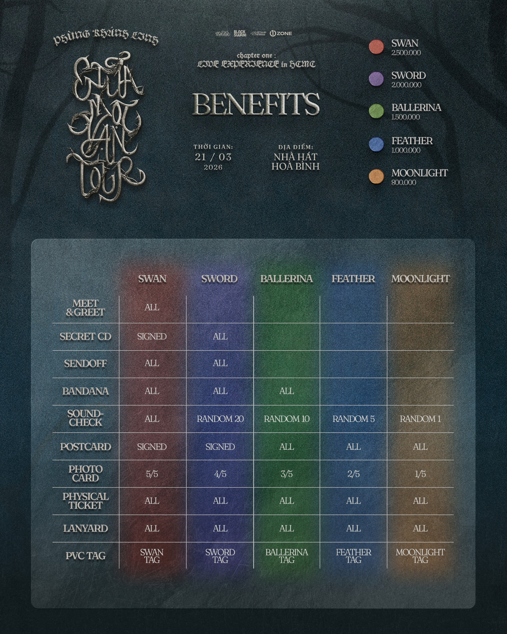 Vé bao gồm: Meet & Greet, Secret CD (Signed), Send-off, Bandana, Sound-check, Postcard (Signed), Photocard (5/5), Physical Ticket, Lanyard, PVC (SWAN Tag).