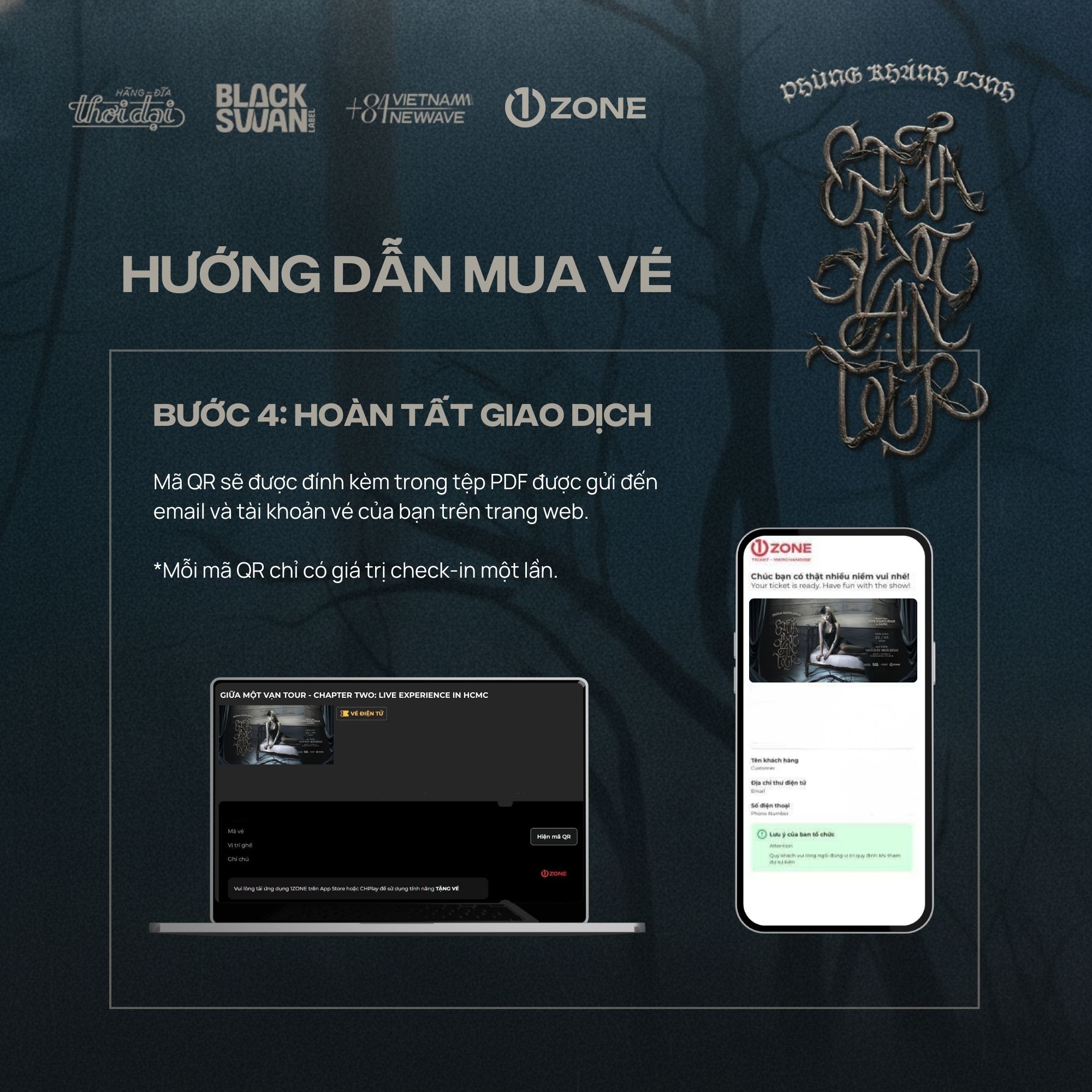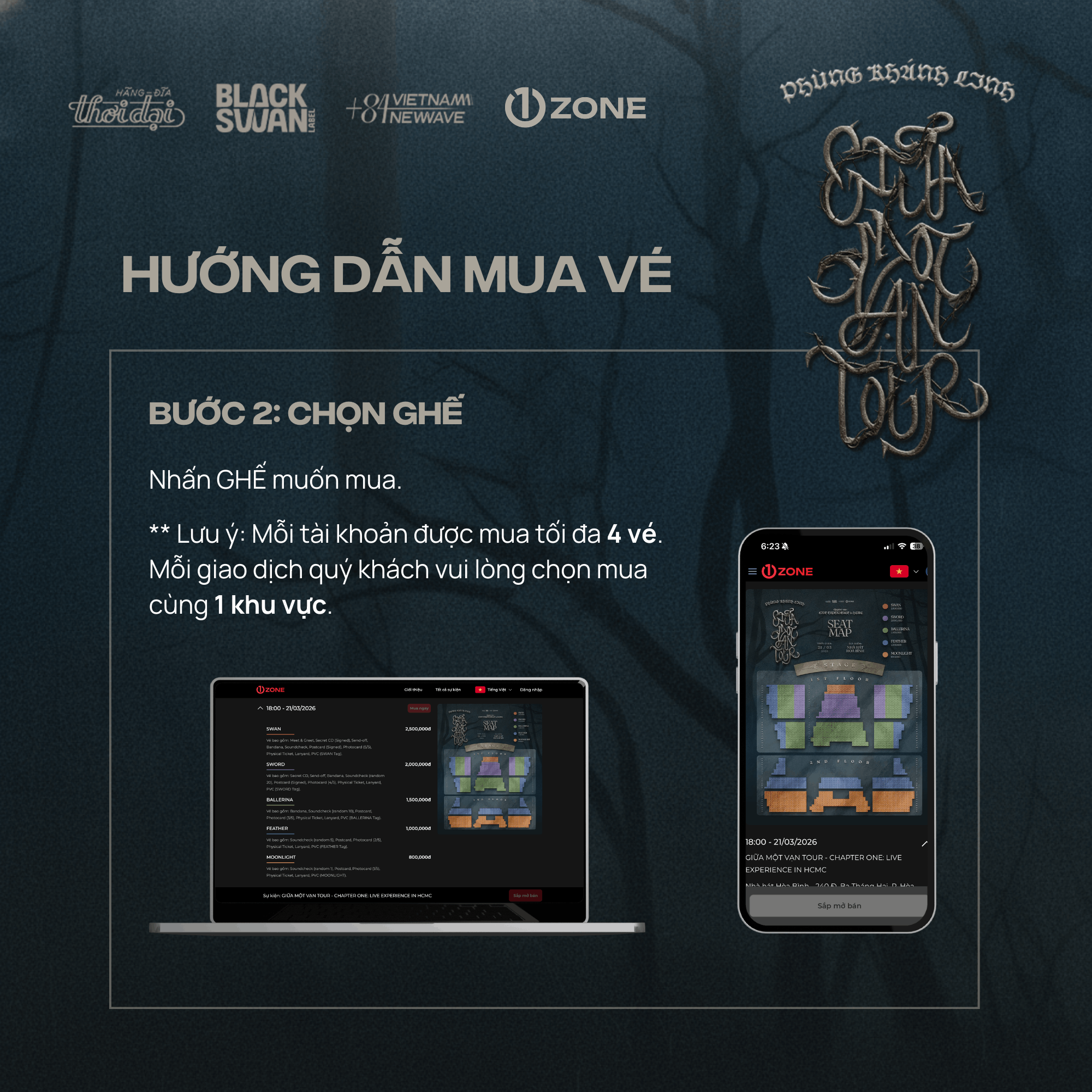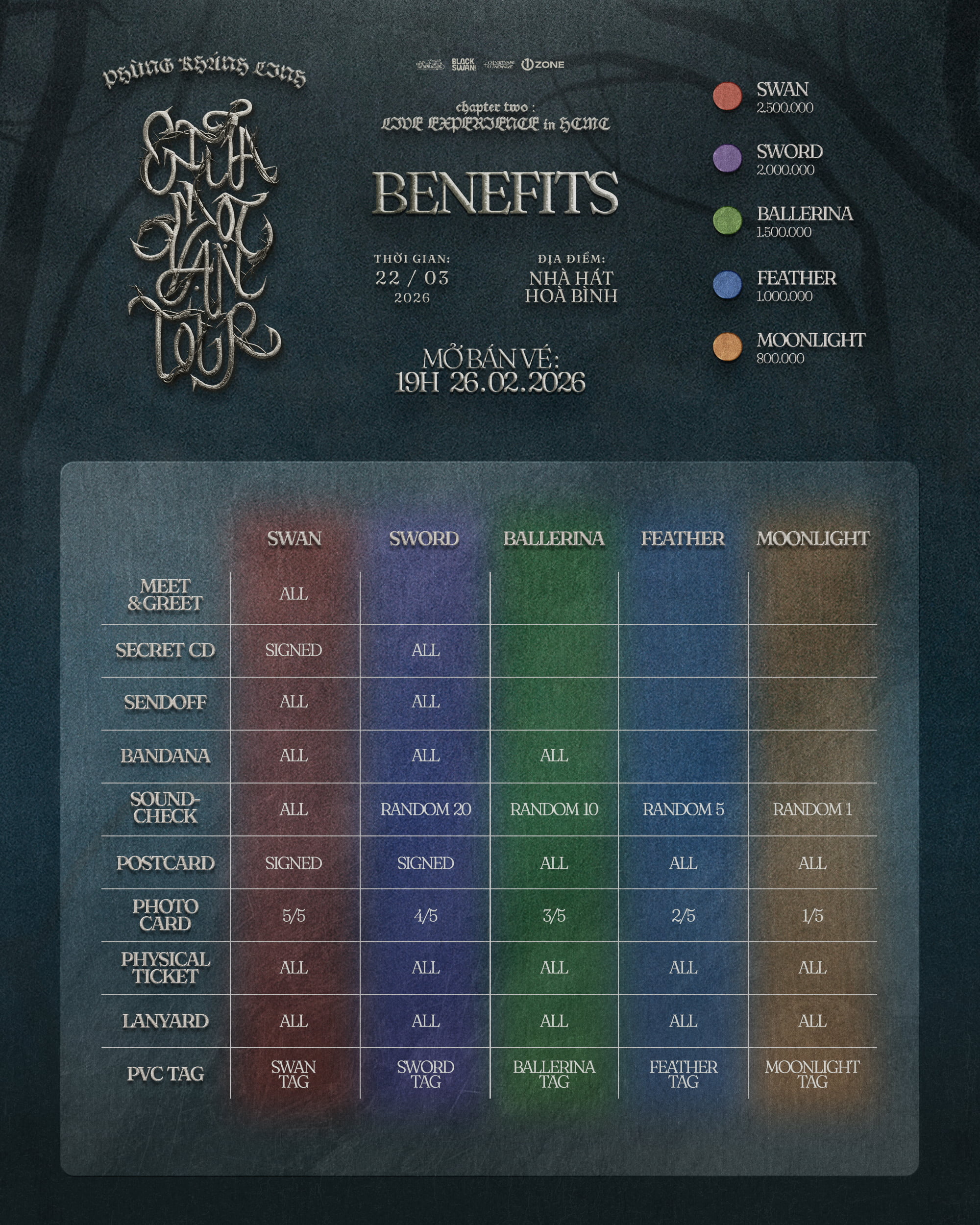 Vé bao gồm: Meet & Greet, Secret CD (Signed), Send-off, Bandana, Sound-check, Postcard (Signed), Photocard (5/5), Physical Ticket, Lanyard, PVC (SWAN Tag).