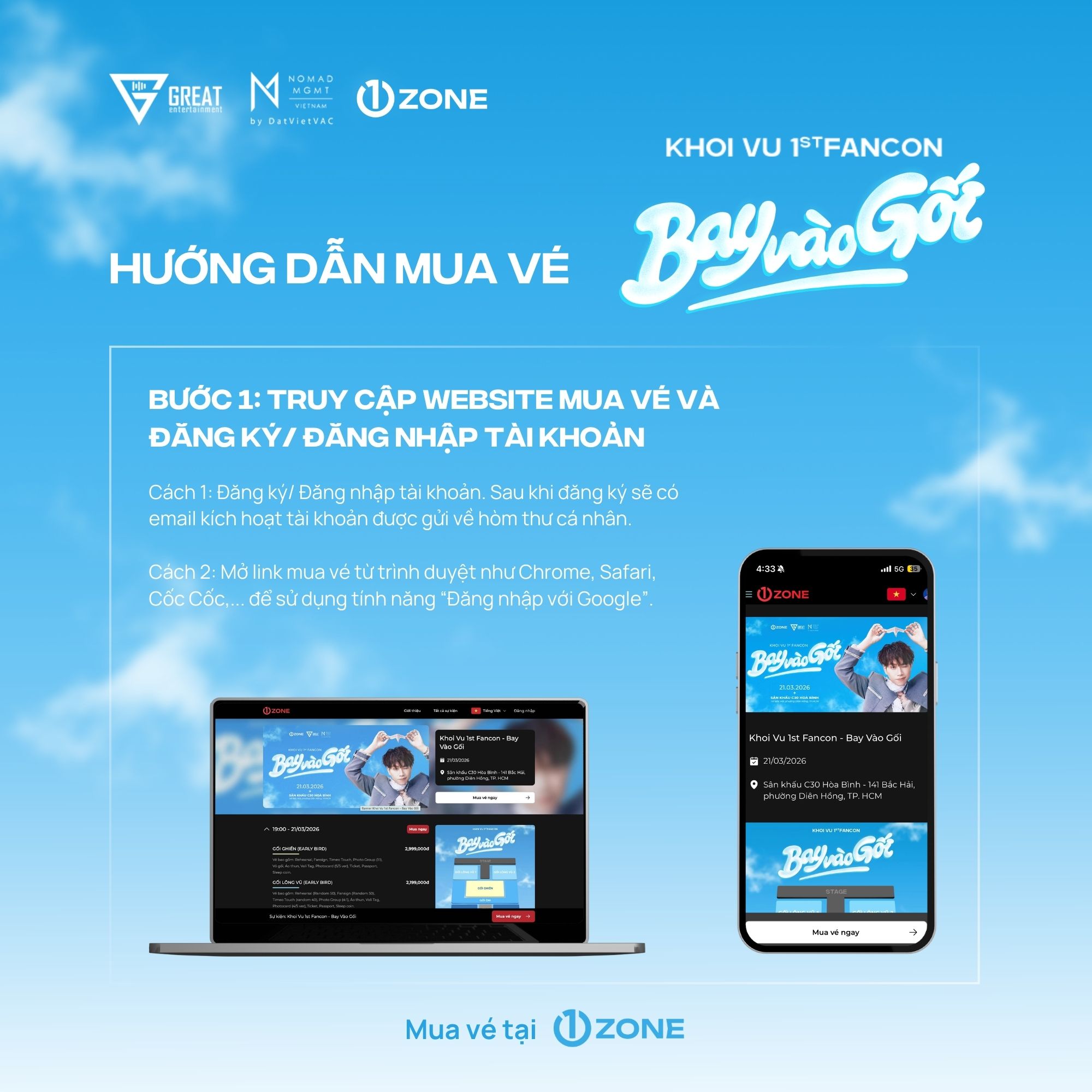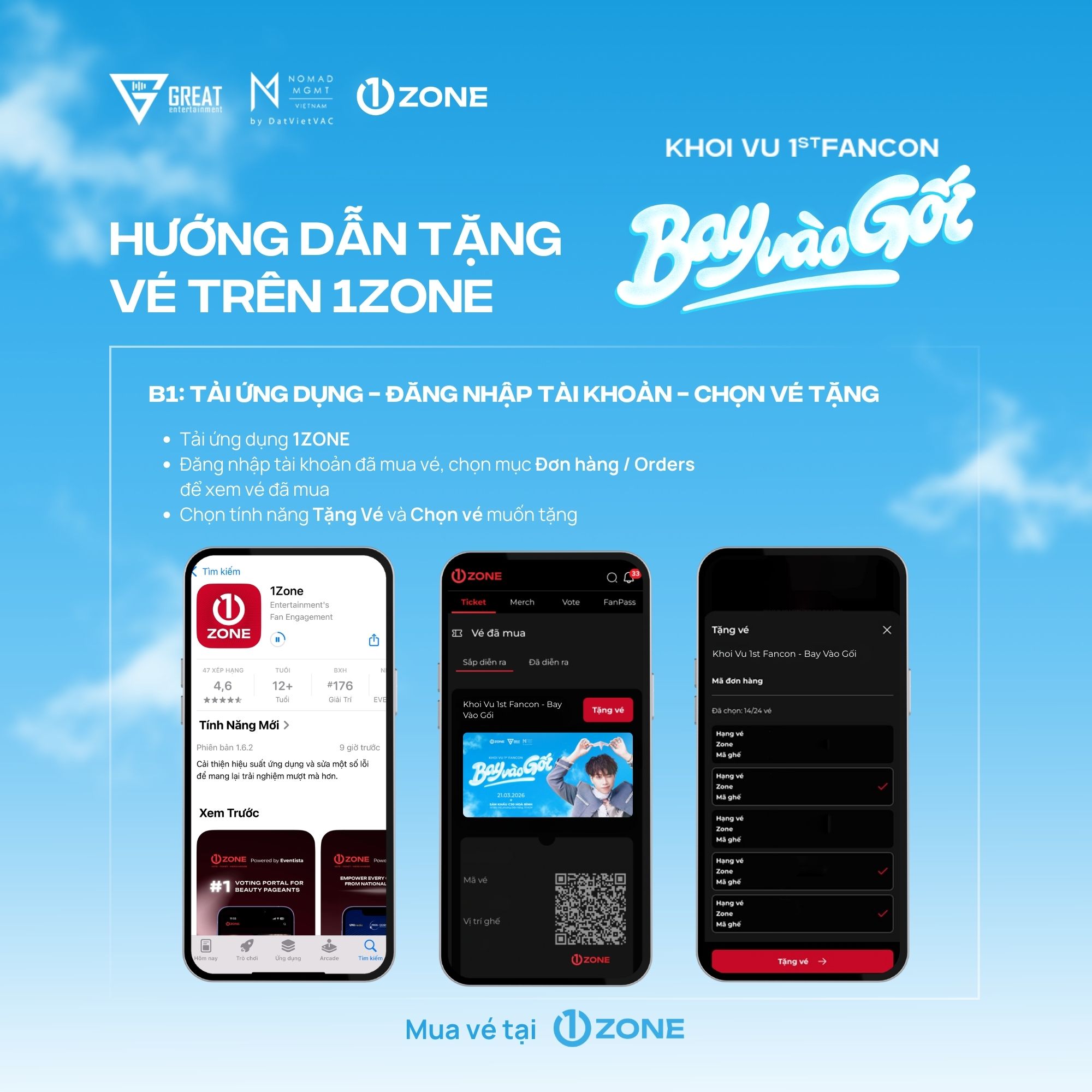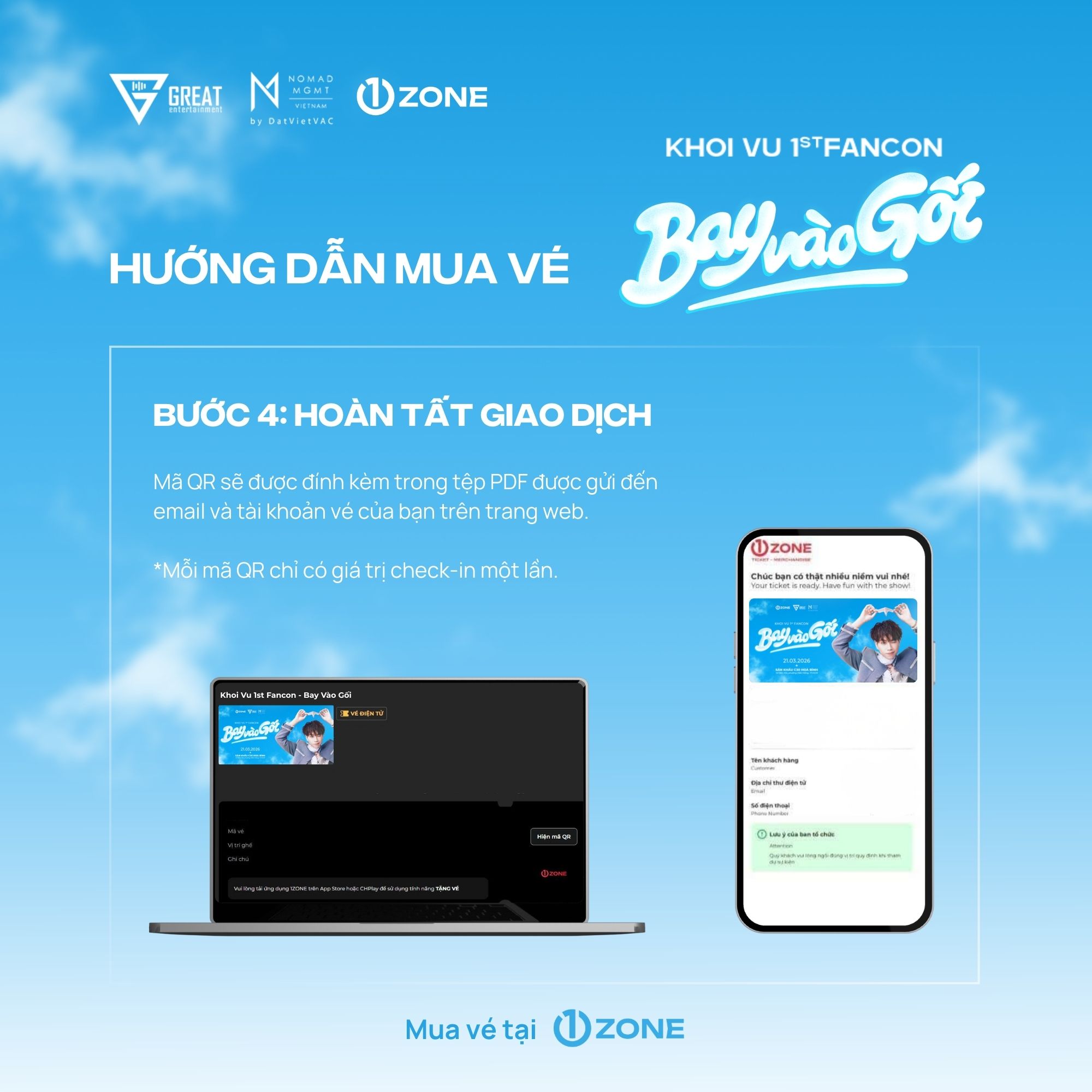 Vé bao gồm: Rehearsal (Random 30), Fansign (Random 20), Timeo Touch (Random 24), Photo Group (6:1), Vali Tag, Photocard (3/5 ver), Ticket, Passport, Sleep Coin.