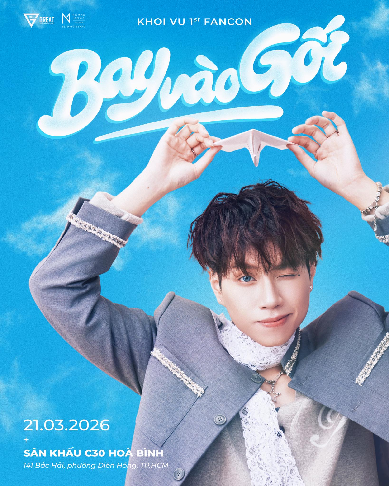 “Bay vào gối” là Fancon đầu tiên của Khoi Vu, mở ra bước đi chính thức đầu tiên sau hành trình bước ra ánh sáng của mình. Fancon được xây dựng như một chuyến bay của giấc mơ, nơi khán giả không chỉ là người xem, mà là những hành khách đồng hành cùng Khoi Vu đi qua các tầng cảm xúc bằng âm nhạc.