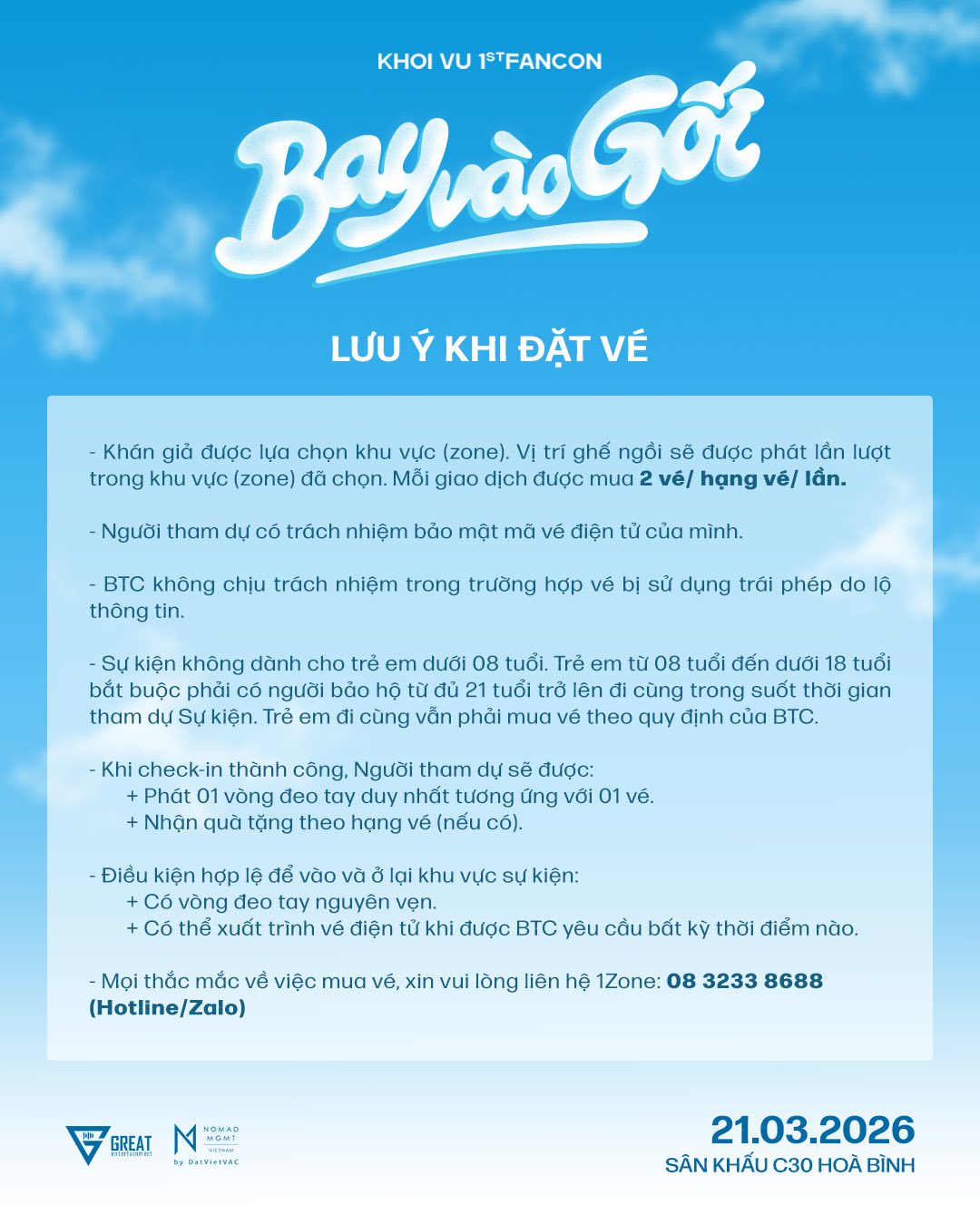 Vé bao gồm: Rehearsal, Fansign, Timeo Touch, Photo Group (1:1), Vỏ gối, Áo Thun, Vali Tag, Photocard (5/5 ver), Ticket, Passport, Sleep Coin.