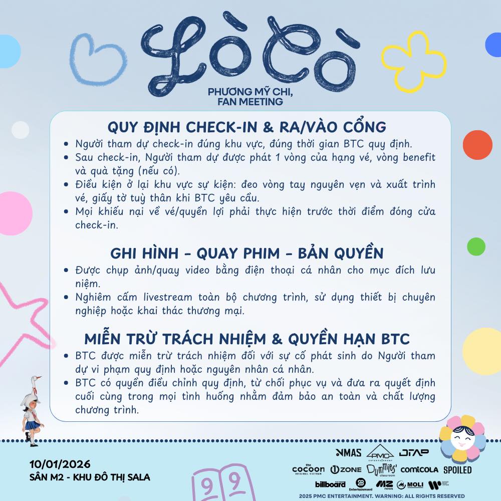 Lò Cò là không gian gặp gỡ đặc biệt nơi Phương Mỹ Chi gửi lời tri ân đến khán giả đã luôn đồng hành suốt 12 năm làm nghề, đặc biệt là cộng đồng người hâm mộ Tổ Cò. Sau hành trình rực rỡ trong năm 2025 với những dấu ấn nổi bật tại Em Xinh Say Hi, Sing! Asia, cùng vai diễn điện ảnh đầu tay trong phim Nhà Gia Tiên của Huỳnh Lập và nhiều cột mốc đáng nhớ khác, fan meeting là dịp để Chi nhìn lại chặng đường đã qua, chia sẻ những câu chuyện phía sau ánh đèn sân khấu và kết nối gần hơn với những người đã luôn tin yêu mình.