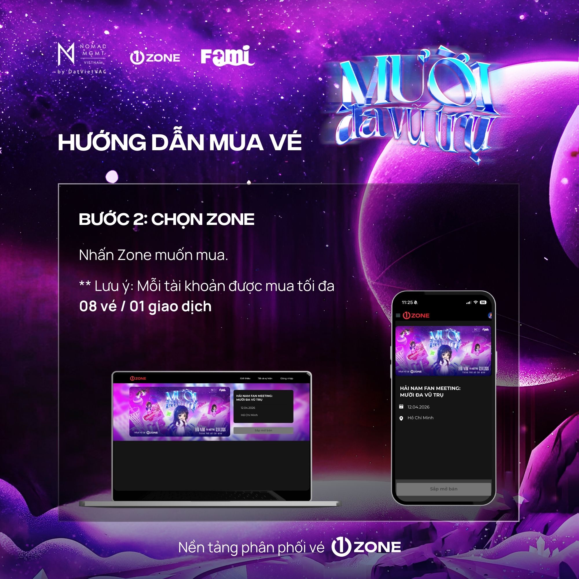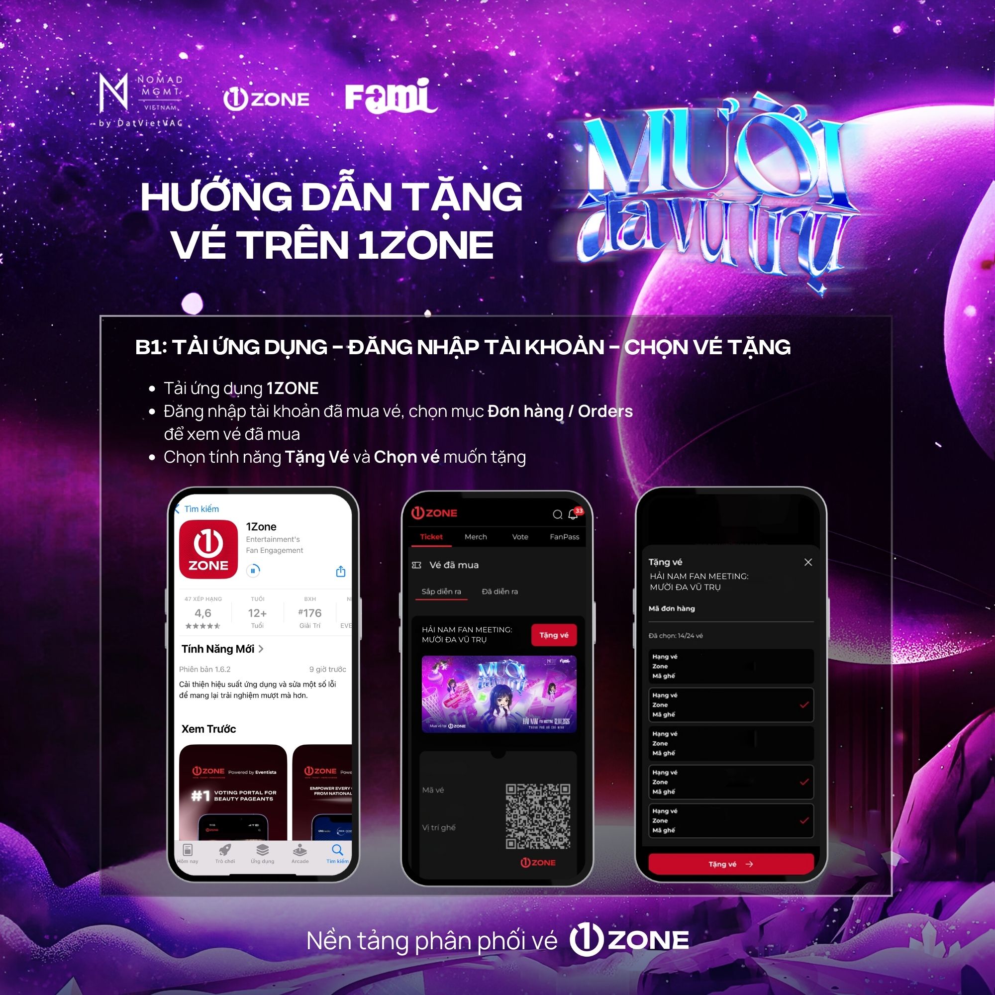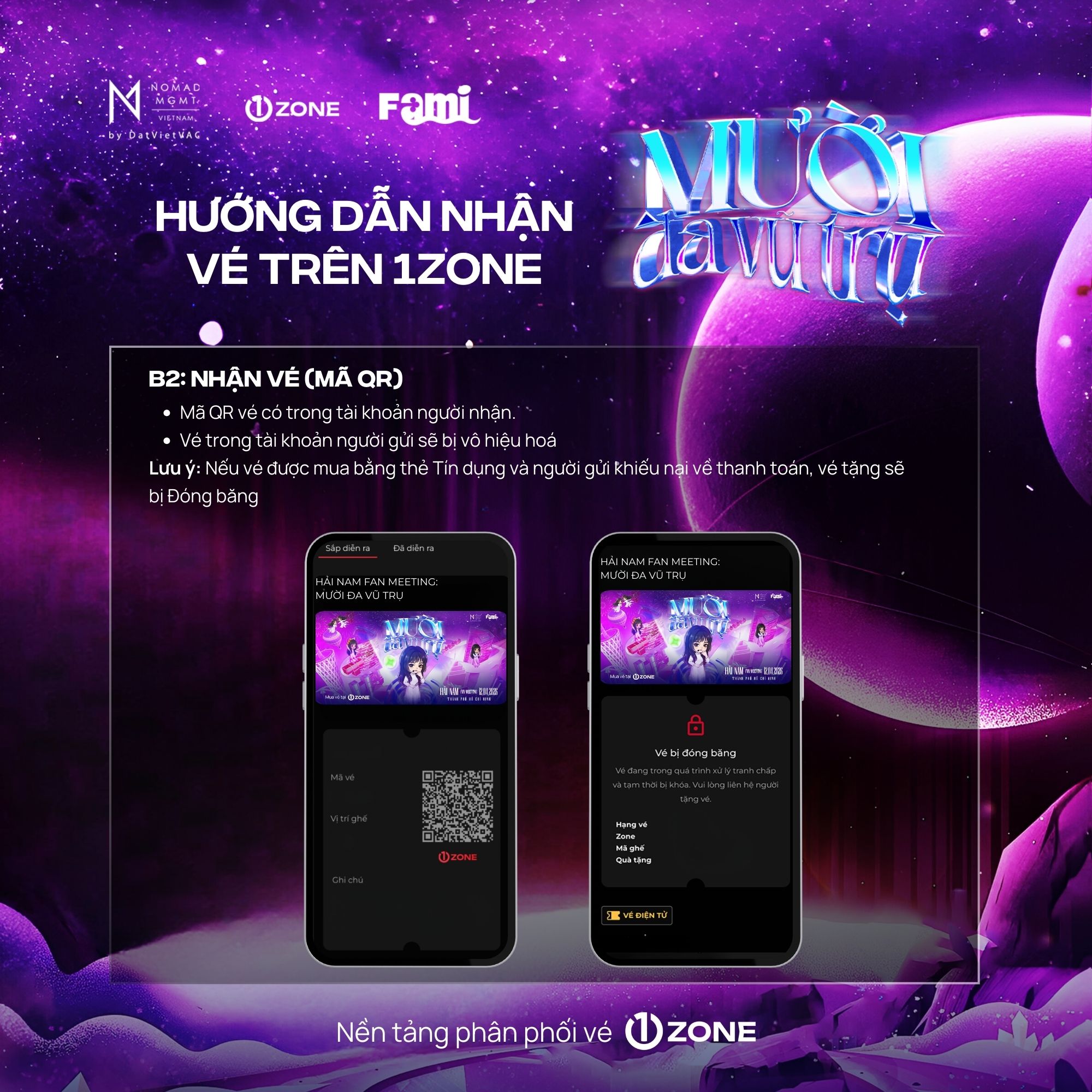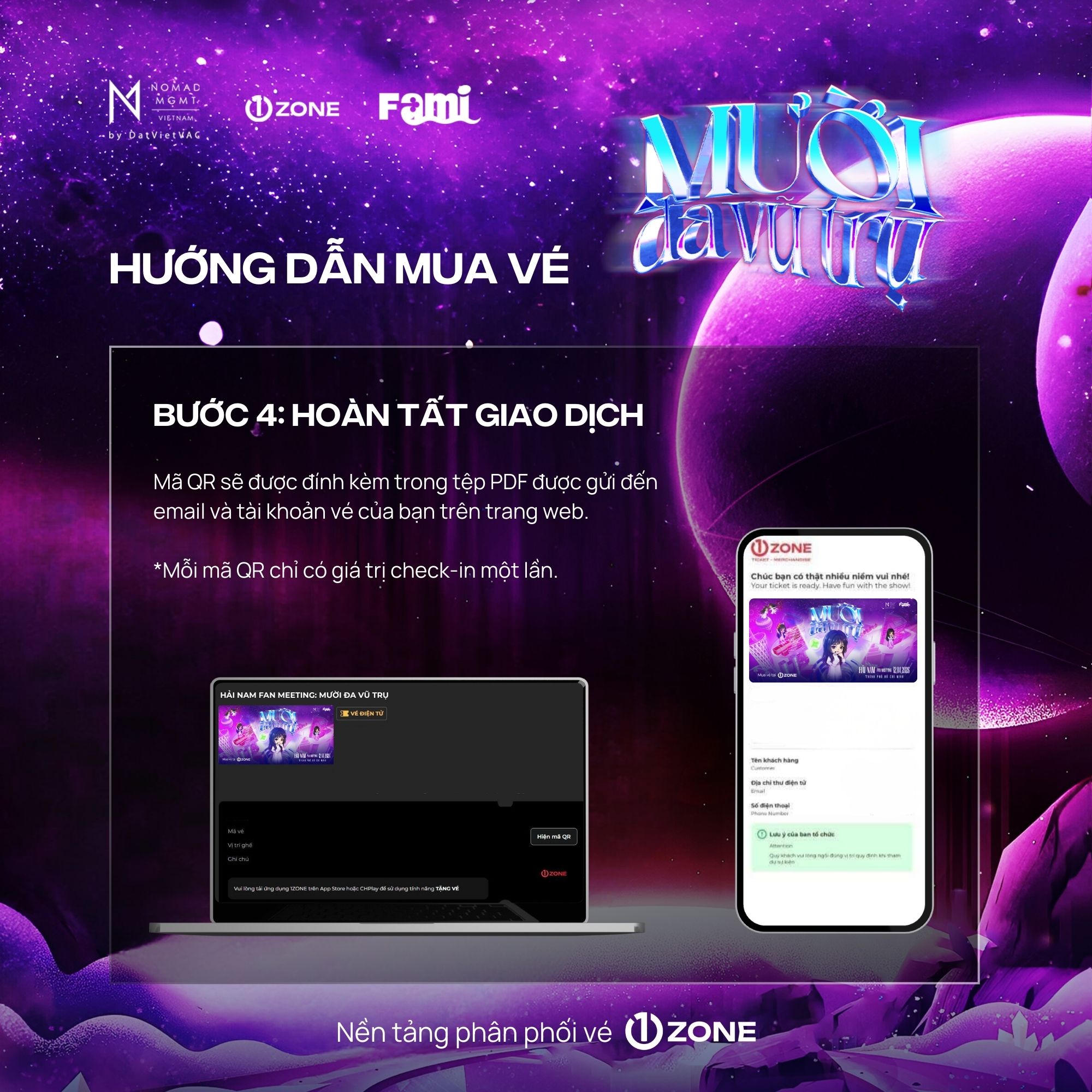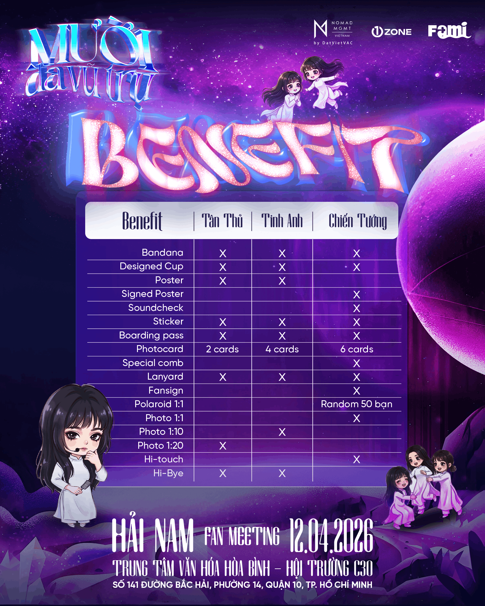 Vé bao gồm: Bandana, Designed Cup, Signed Poster, Soundcheck, Sticker, Boarding Pass, Photocard (6 cards), Special Comb, Lanyard, Fansign, Polaroid 1:1 (Random 50), Photo 1:1, Hi-Touch.