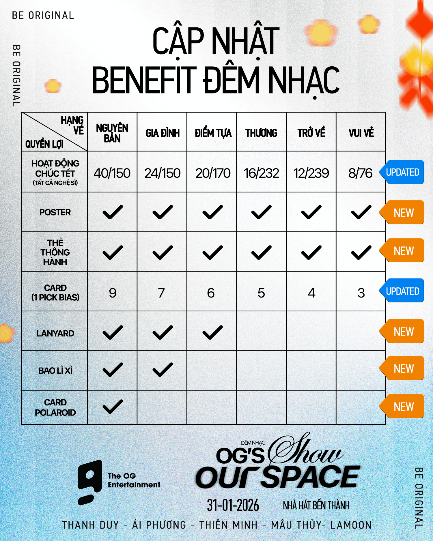 Vé bao gồm: Tham gia hoạt động chúc Tết (tất cả nghệ sĩ – 16/232 suất); Poster; Thẻ thông hành; 05 card (1 pick bias).