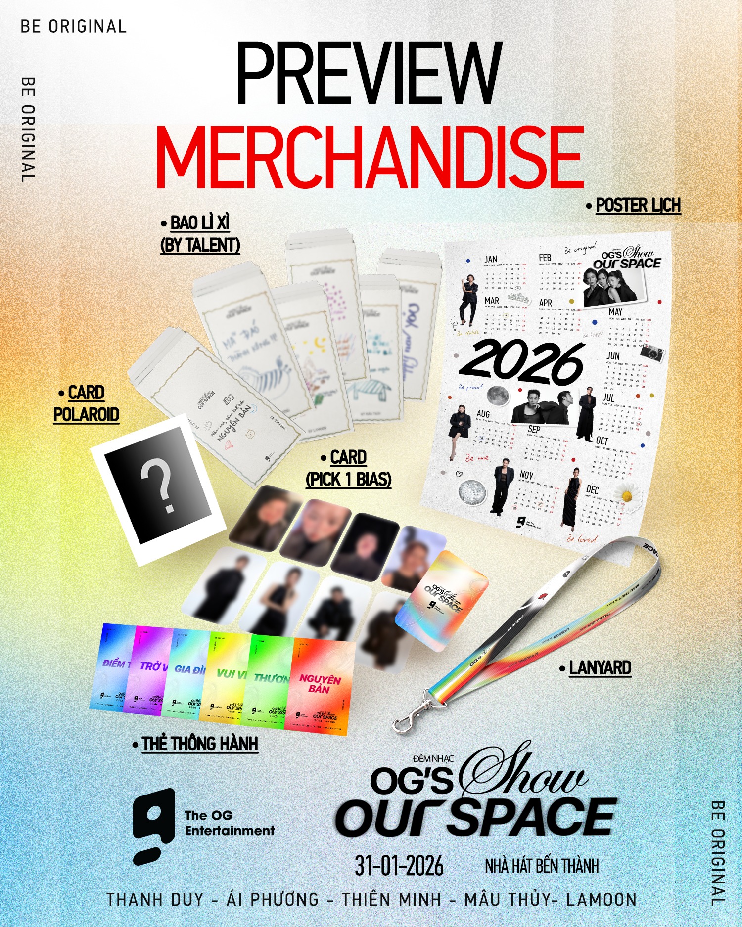 Vé bao gồm: Tham gia hoạt động chúc Tết (tất cả nghệ sĩ – 40/150 suất); Poster; Thẻ thông hành; 09 card (1 pick bias); Lanyard; Bao lì xì; Card polaroid.