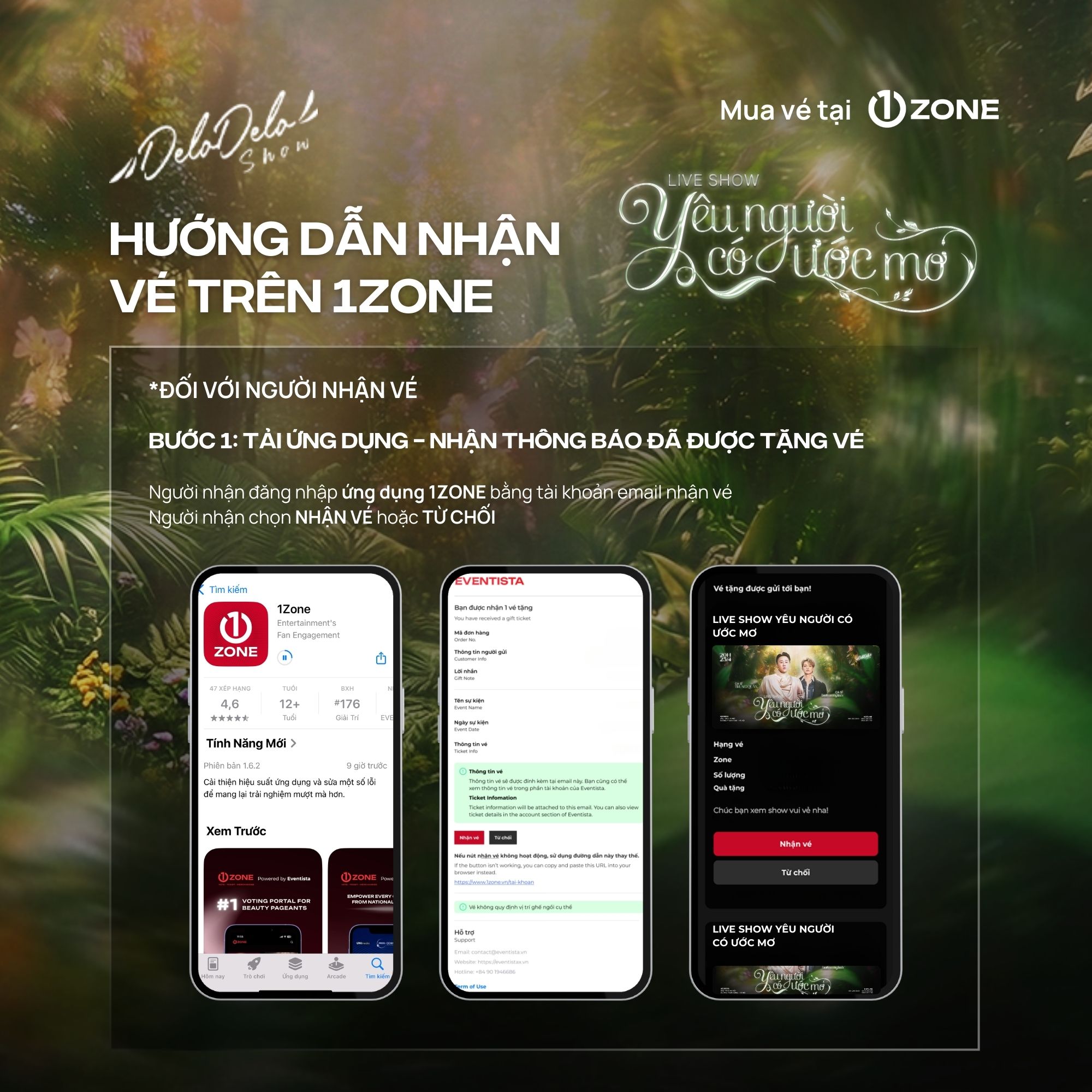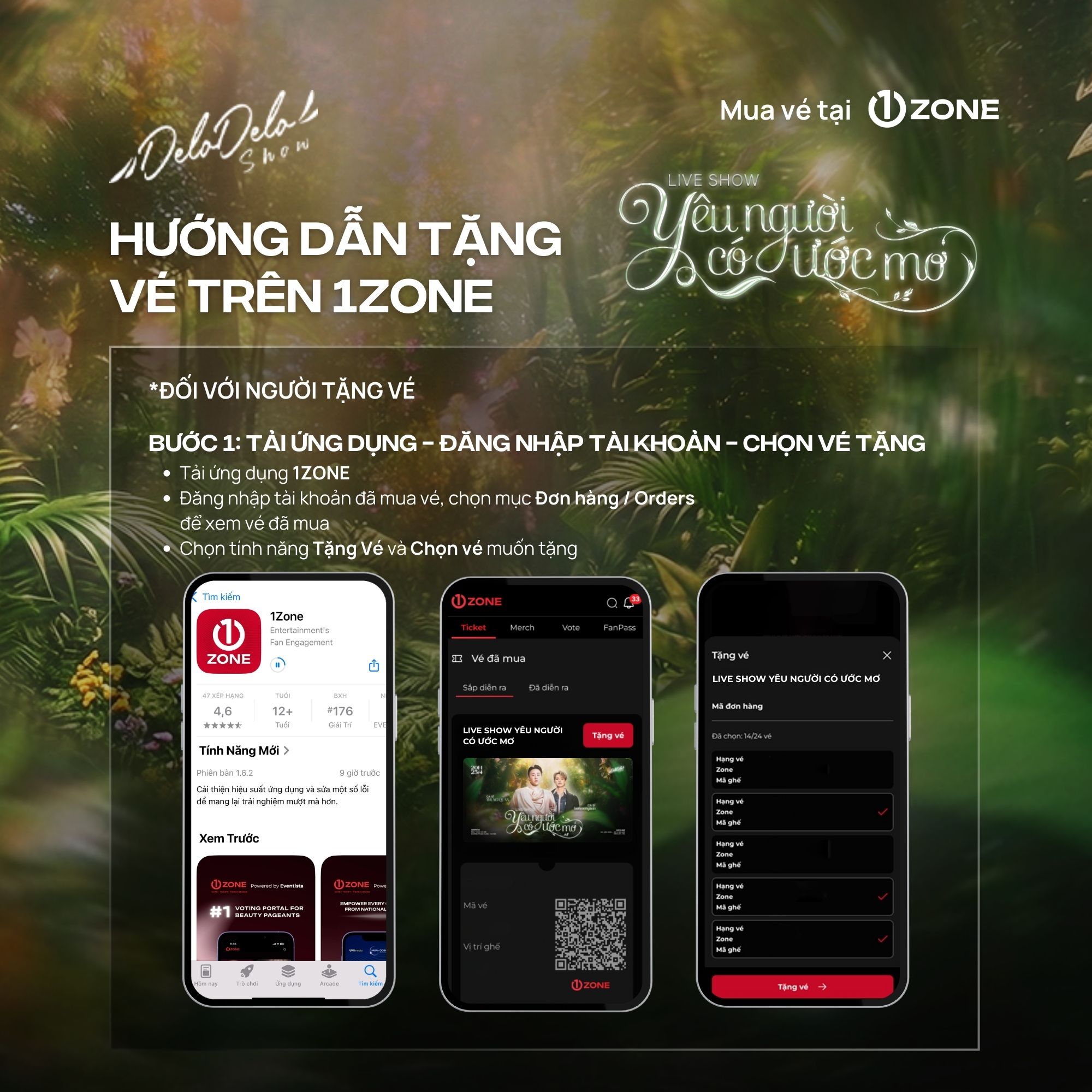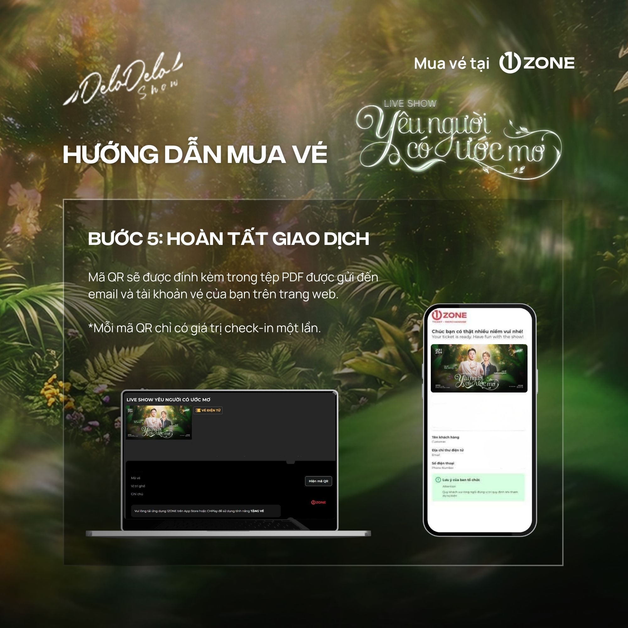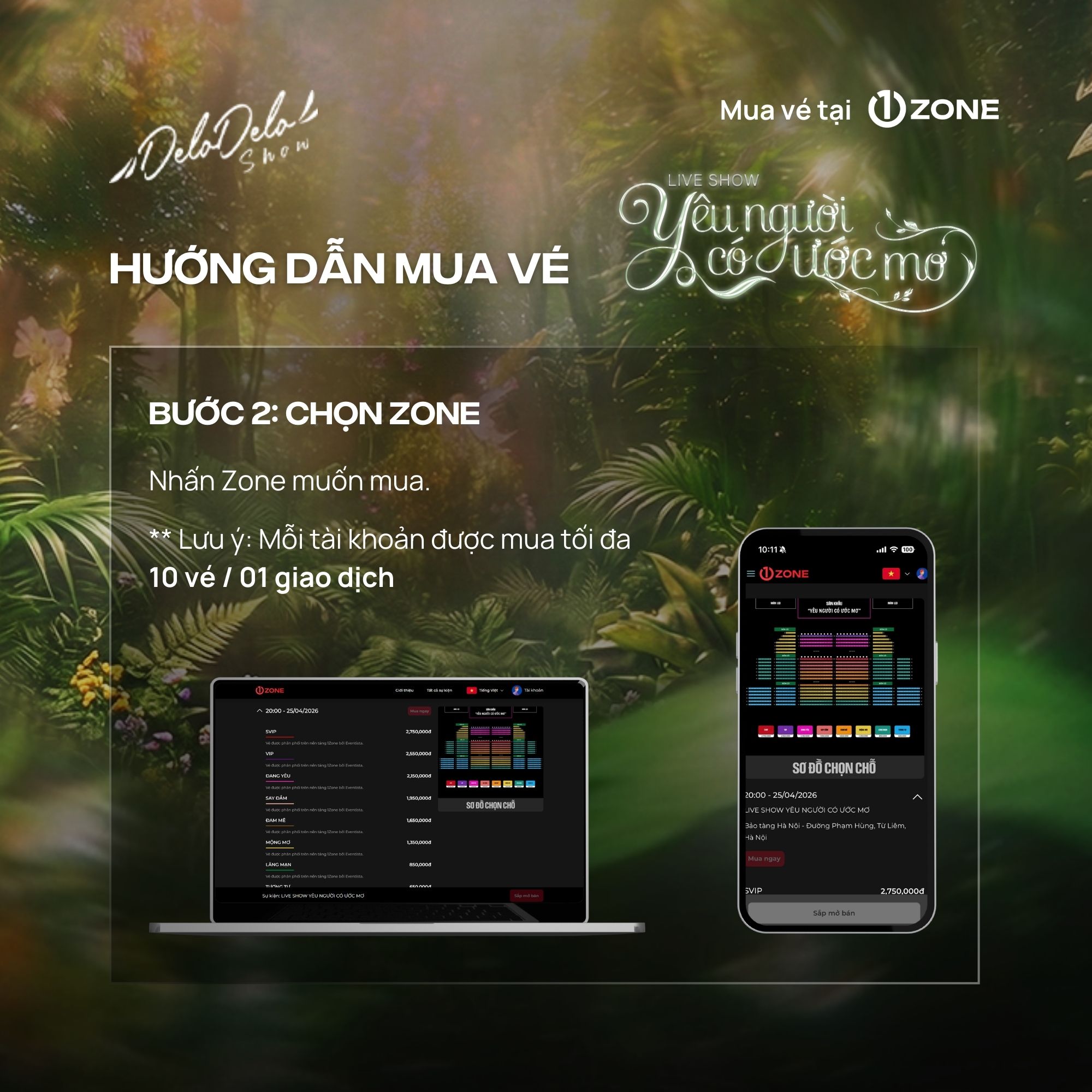 + 1ZONE là đơn vị bán vé độc quyền duy nhất được Delodelo Show ủy quyền cho Liveshow "Yêu người có ước mơ" Quý khán giả cần thận trọng tránh mua phải vé trên các cổng bán vé giả mạo.